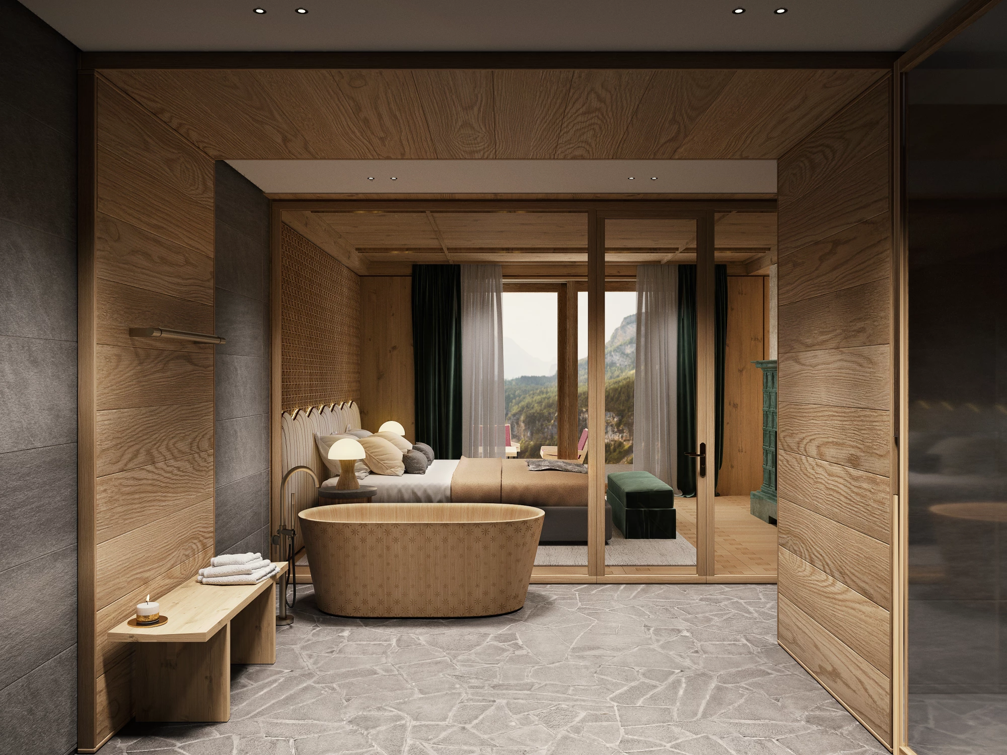 Inspired by Casa Garelli by Carlo Mollino, a 1664 granary transformed into a vacation home, the suite captures the harmony between vernacular architecture and modernity. Distinctive elements such as the "bolero" (a mushroom-shaped detail for protection), the ribbon window, and Blokbau flooring are reinterpreted with a contemporary twist.